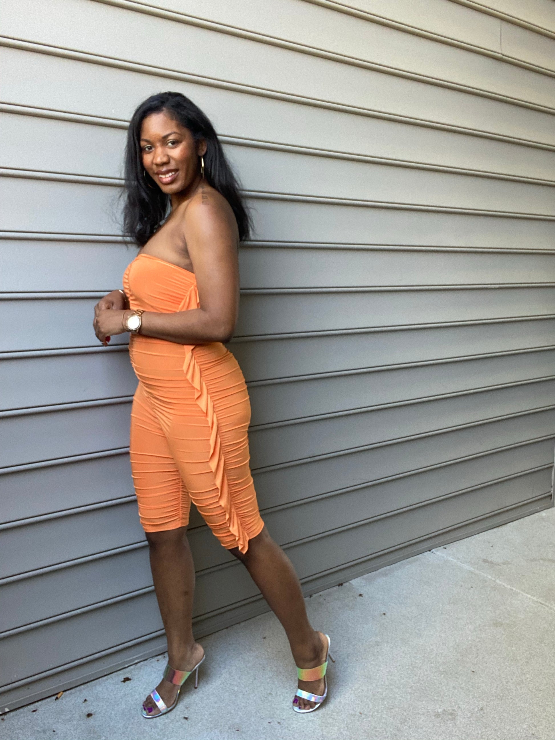 • Strapless sweetheart tube ruched side ruffles biker short romper