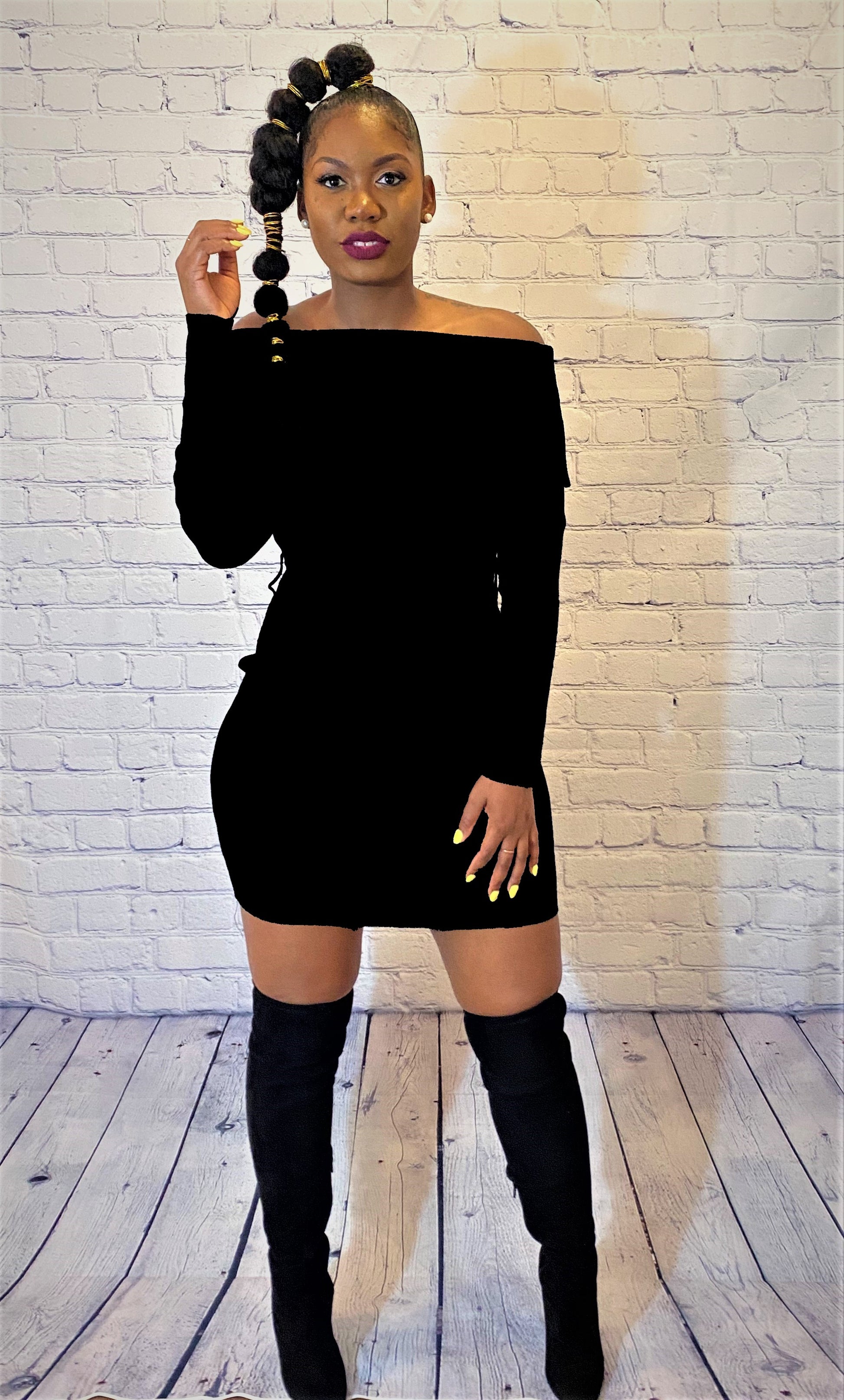 Get into this look! With off the shoulder and long sleeve details this number is seriously sassy and flirty. Style this sexy bodycon dress with some heeled ankle boots for a saucy look.