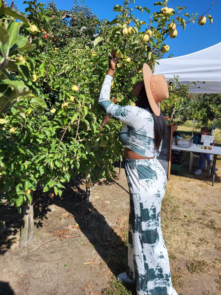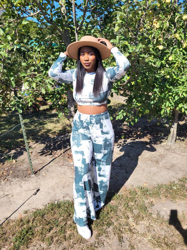This unique two piece features a very stylish print, crop top with long sleeves and comfy wide leg pants.