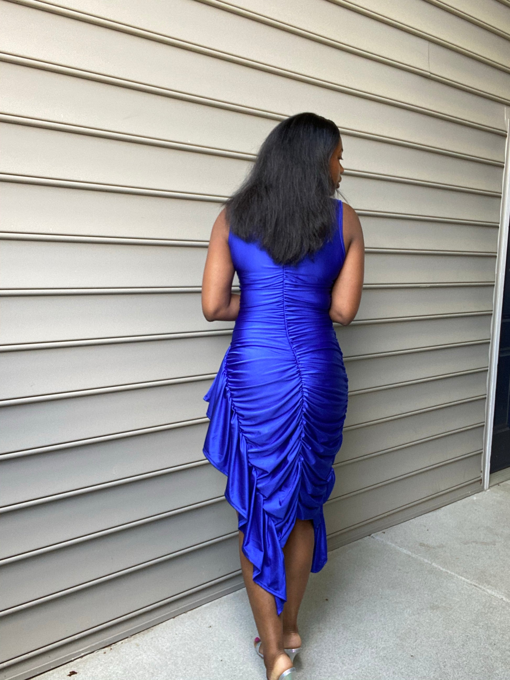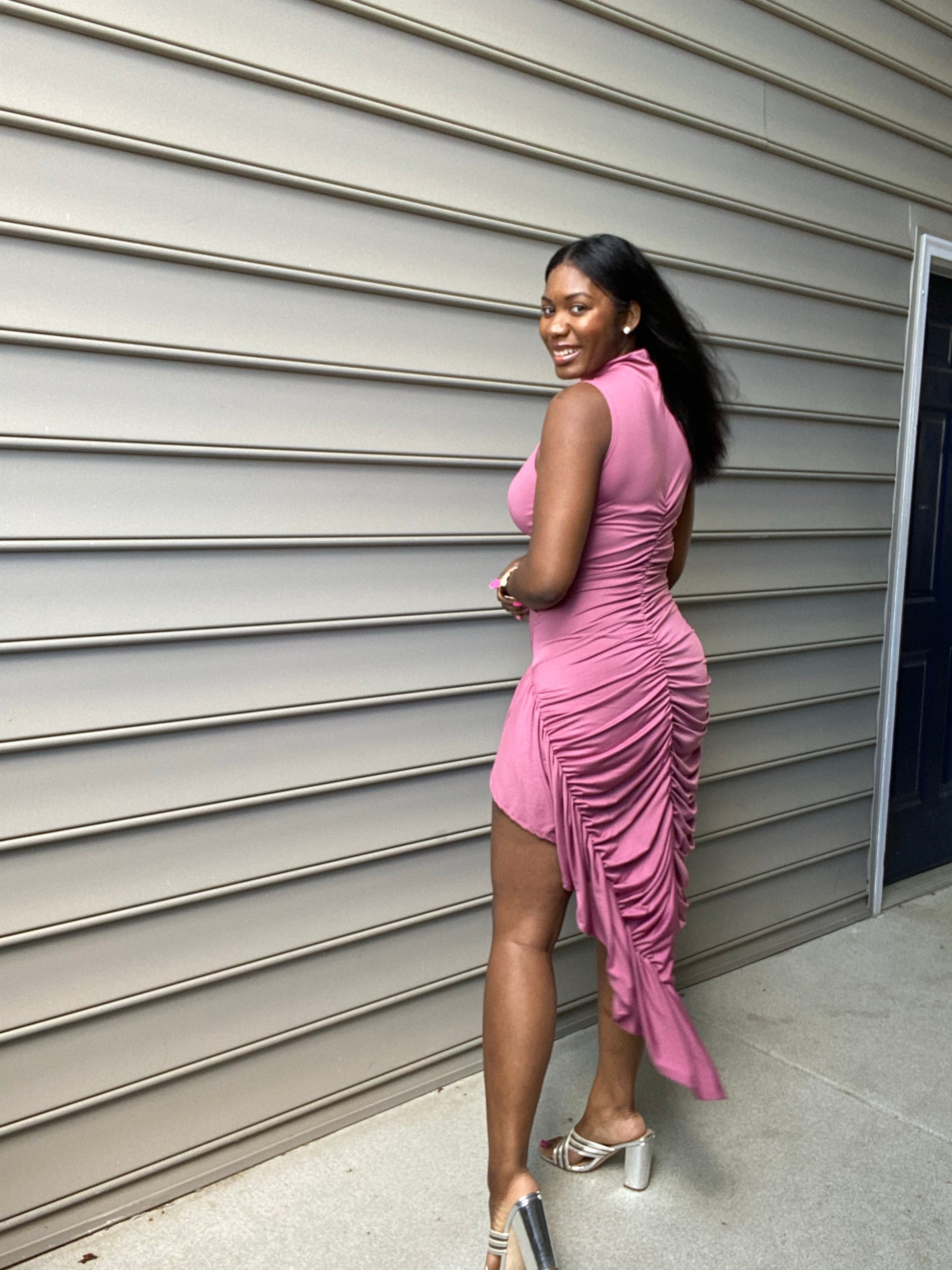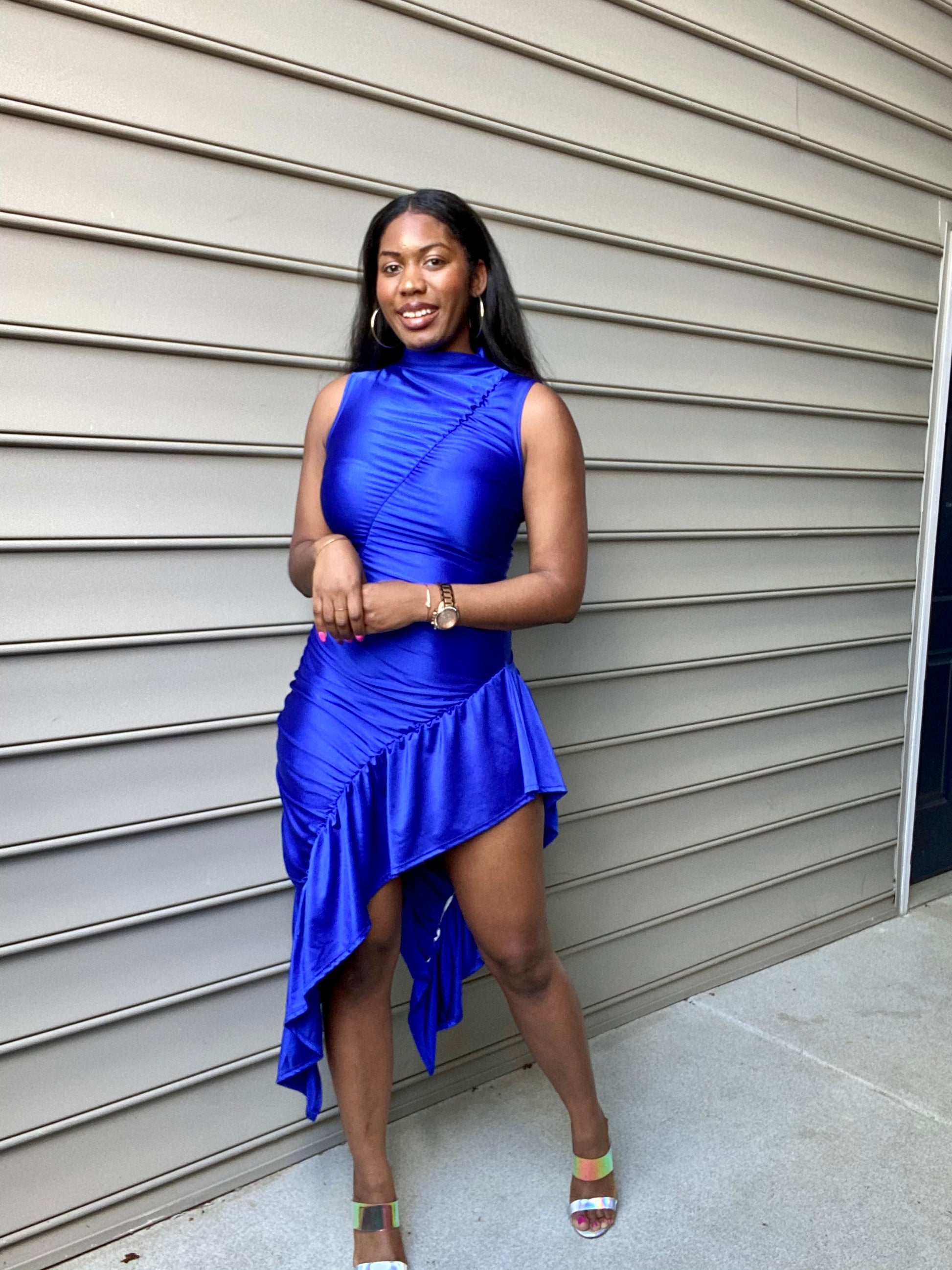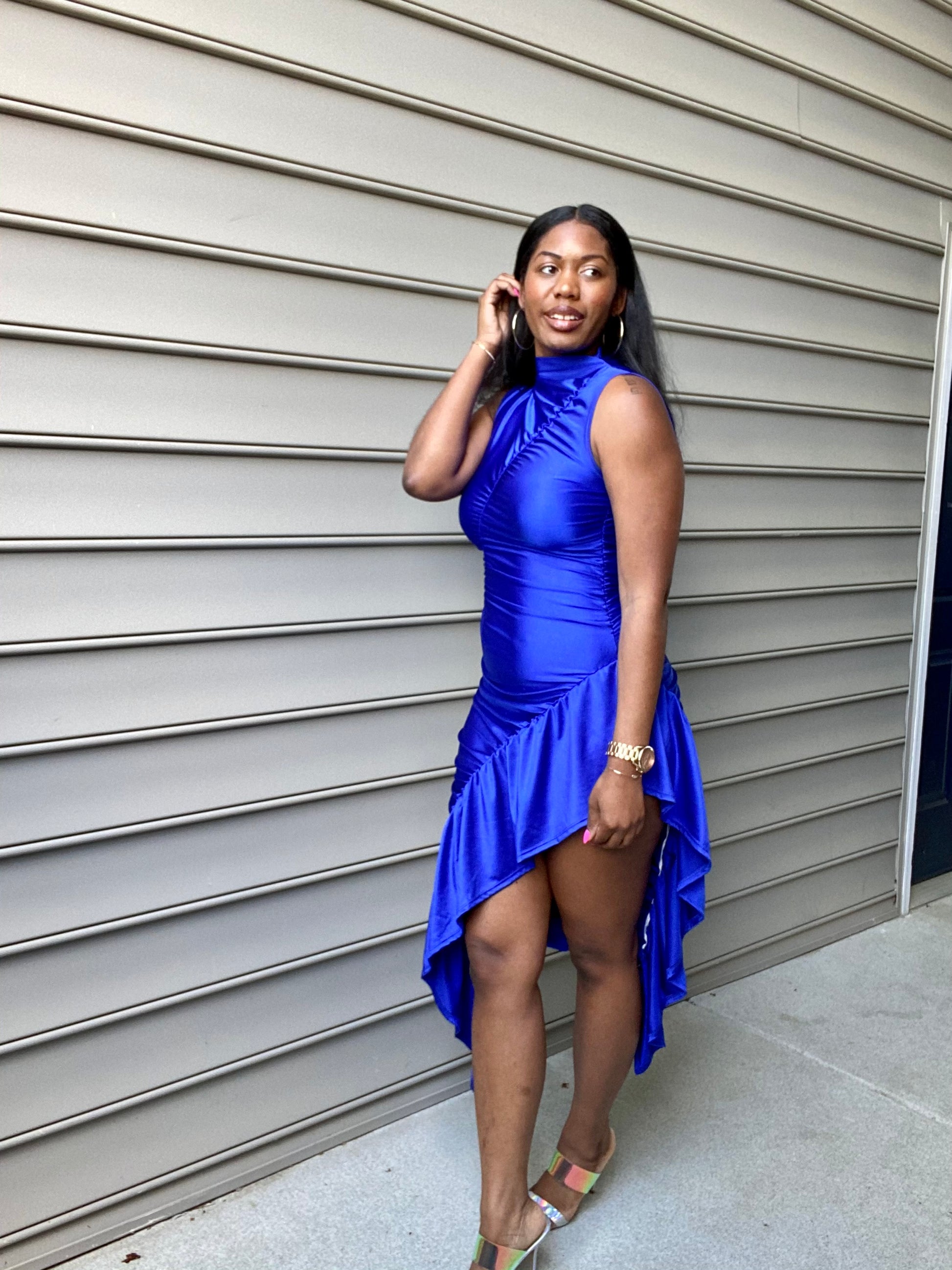 - Mock Neck Sleeveless Ruffle unbalanced bodycon dress