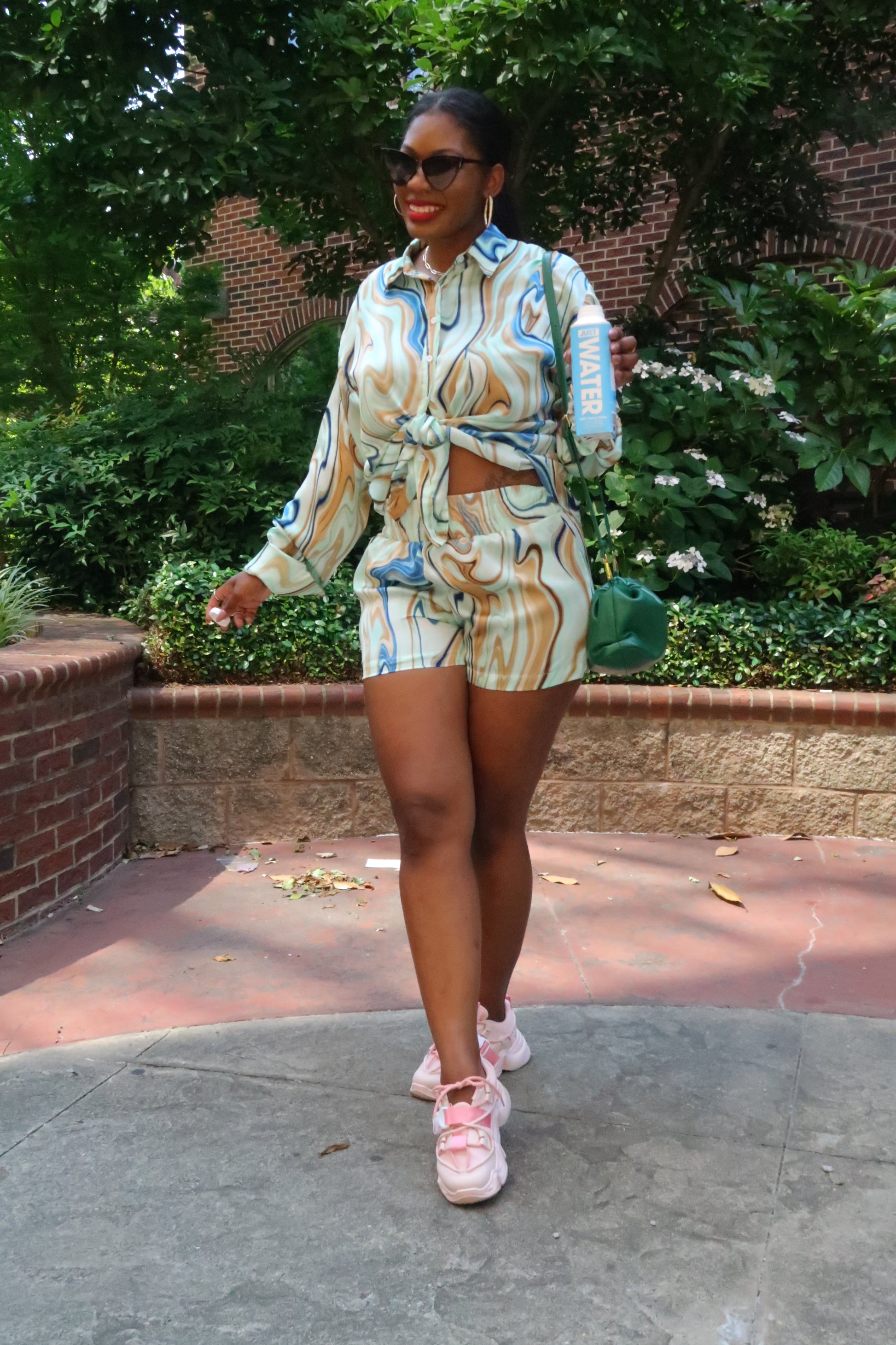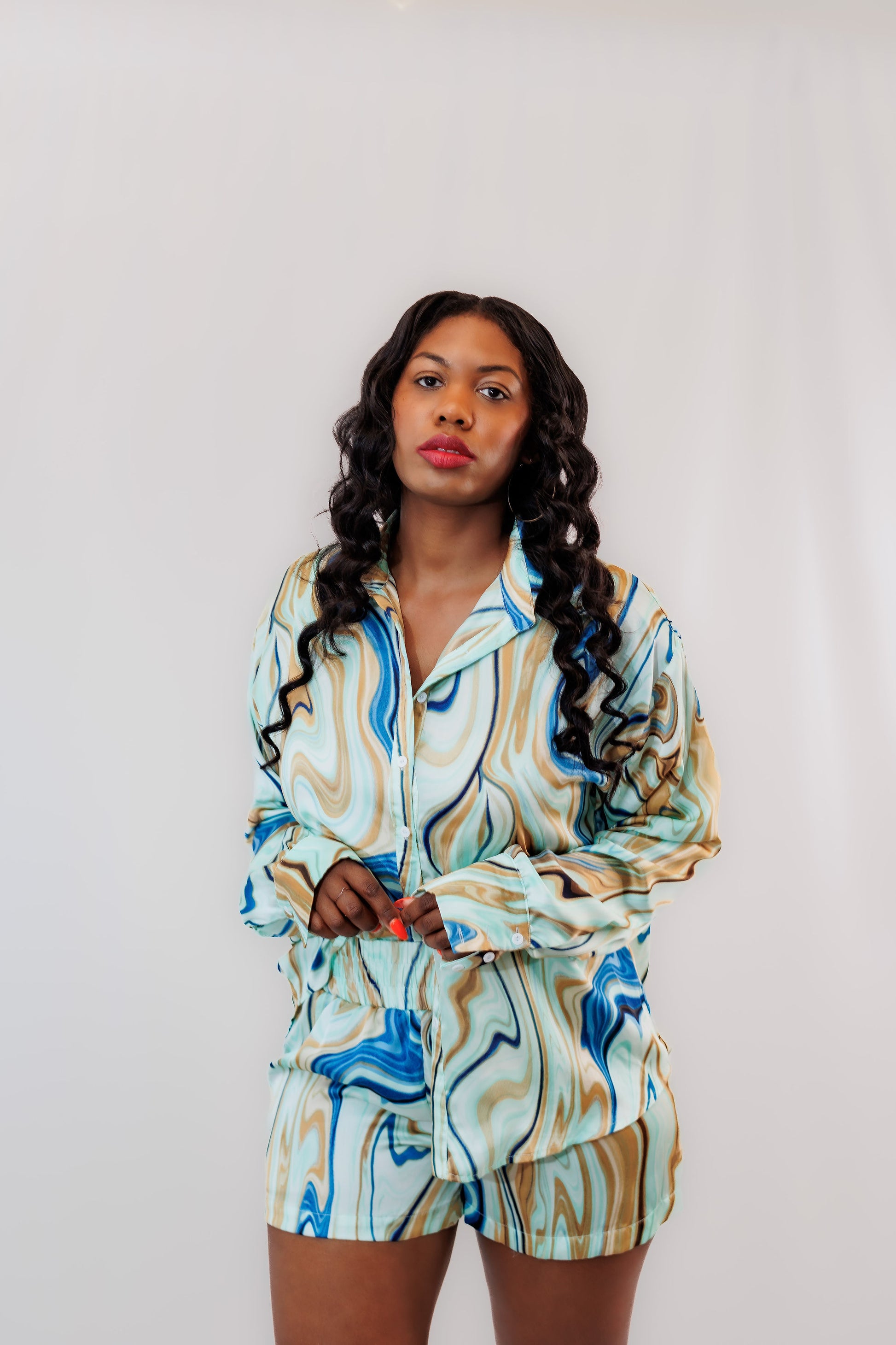 It's giving comfy luxury on an International trip. This silky button down top w/ matching boxer shorts can be paired with heels for happy hour, sneakers for a casual but keeping it cute day, or slides for a cute day date or event. You can style this look several different ways: Tie the top up at the waist, wear it open, roll up the sleeves, tuck the top, or be BOLD and wear the set separately. It's all in the matter of how you style it, babes.