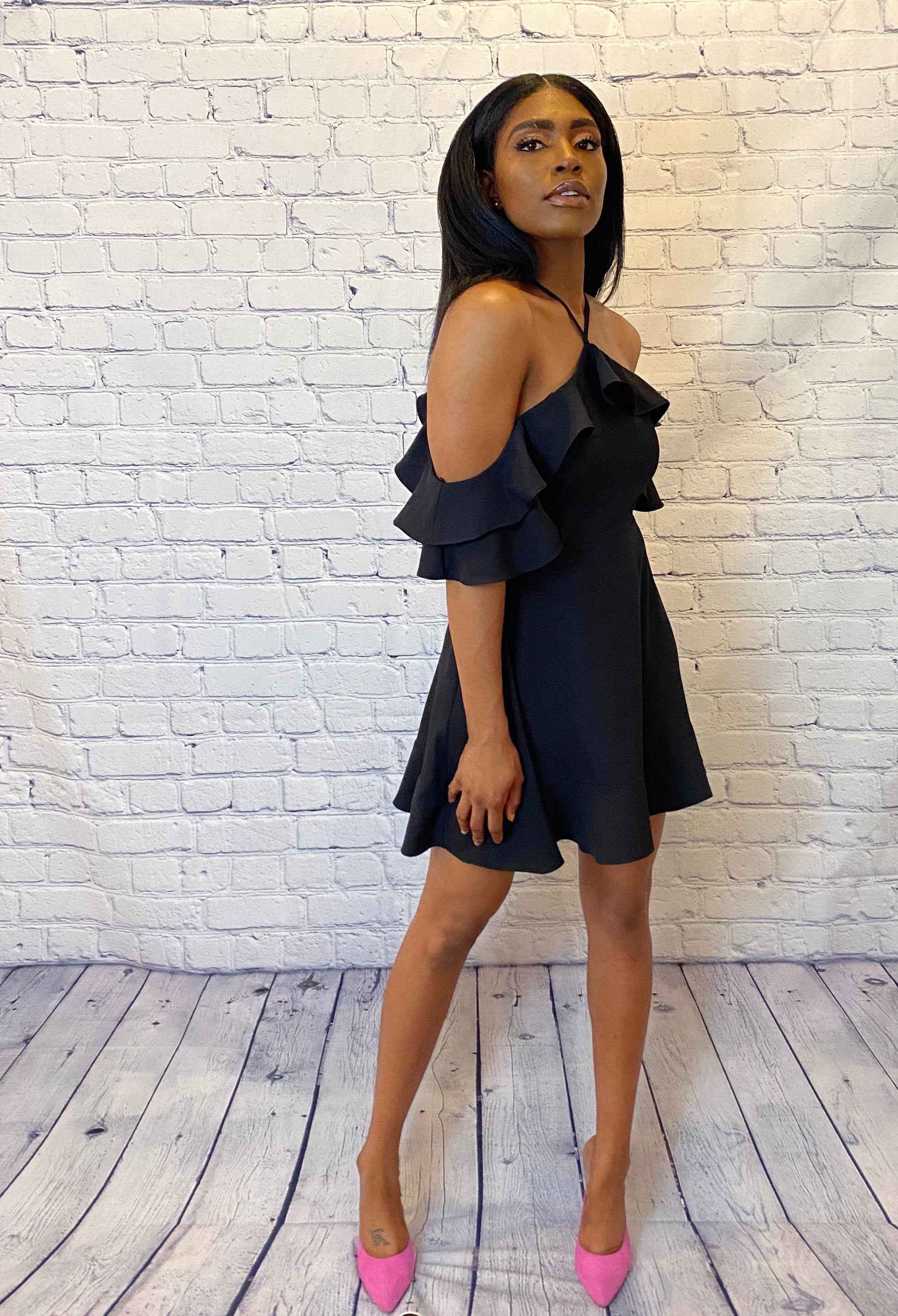 MINI DRESS FEATURING A RUFFLED OPEN-SHOULDER. CAMI STRAPS THAT CROSS IN THE FRONT